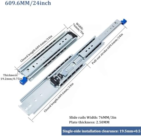 Welcome to my store Specifications Material: Cold-rolled steel Finish: Galvanized Quantity: 1 pair (2 pieces), including mounting screws Weight capacity: 480 lbs / 220 kg Main Features With Locking Function Includes inner slide, middle slide and outer slide. Gently pull up/down the locking handle to lock/unlock the extension drawer slide. Silent Design Details Nylon buffer reduces direct contact between the outer and inner channels. Ball bearing action creates a quiet environment when working. Cold Rolled Steel High-grade cold rolled steel with galvanized surface can effectively prevent the drawer rail from scratching, deformation and rust. Please refer to the above guide to select the appropriate size of drawer slide. The length of the slide cannot exceed the depth of the cabinet. Easy and Quick Assembly During installation, the bolts between the slide and the drawer are best tightened from the outside to the inside, and the bolts between the drawer and the cabinet should be tightened from the inside to the outside. Wide Applications Side-mounted drawer slides are suitable for a variety of uses: shelves, cabinets, industrial drawers, RVs, trucks, vending machines, etc.
