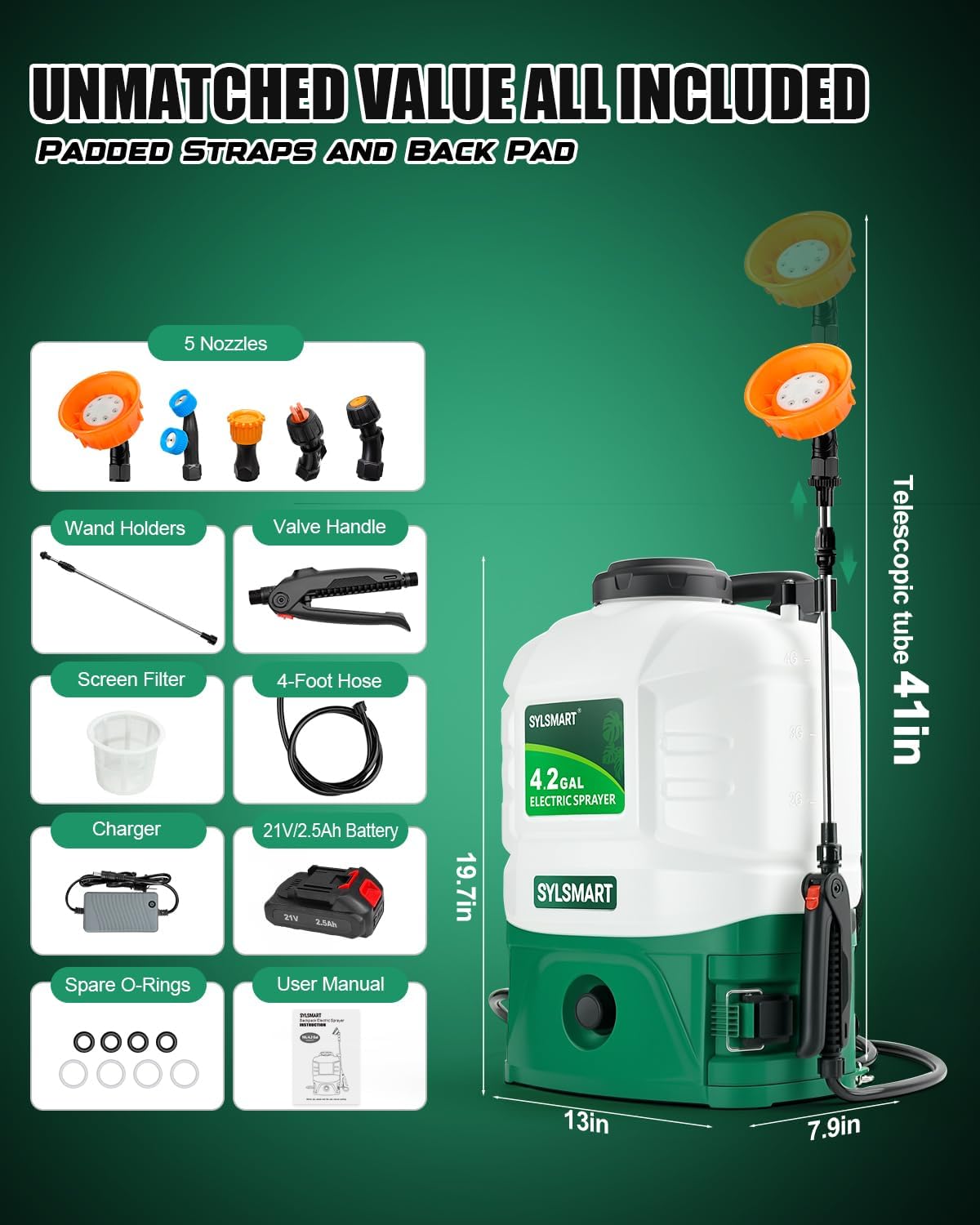 | Included Components | Battery Charger, 5 Nozzles, 2.5Ah Battery, Measuring Cup, Premium Hose and wand |
