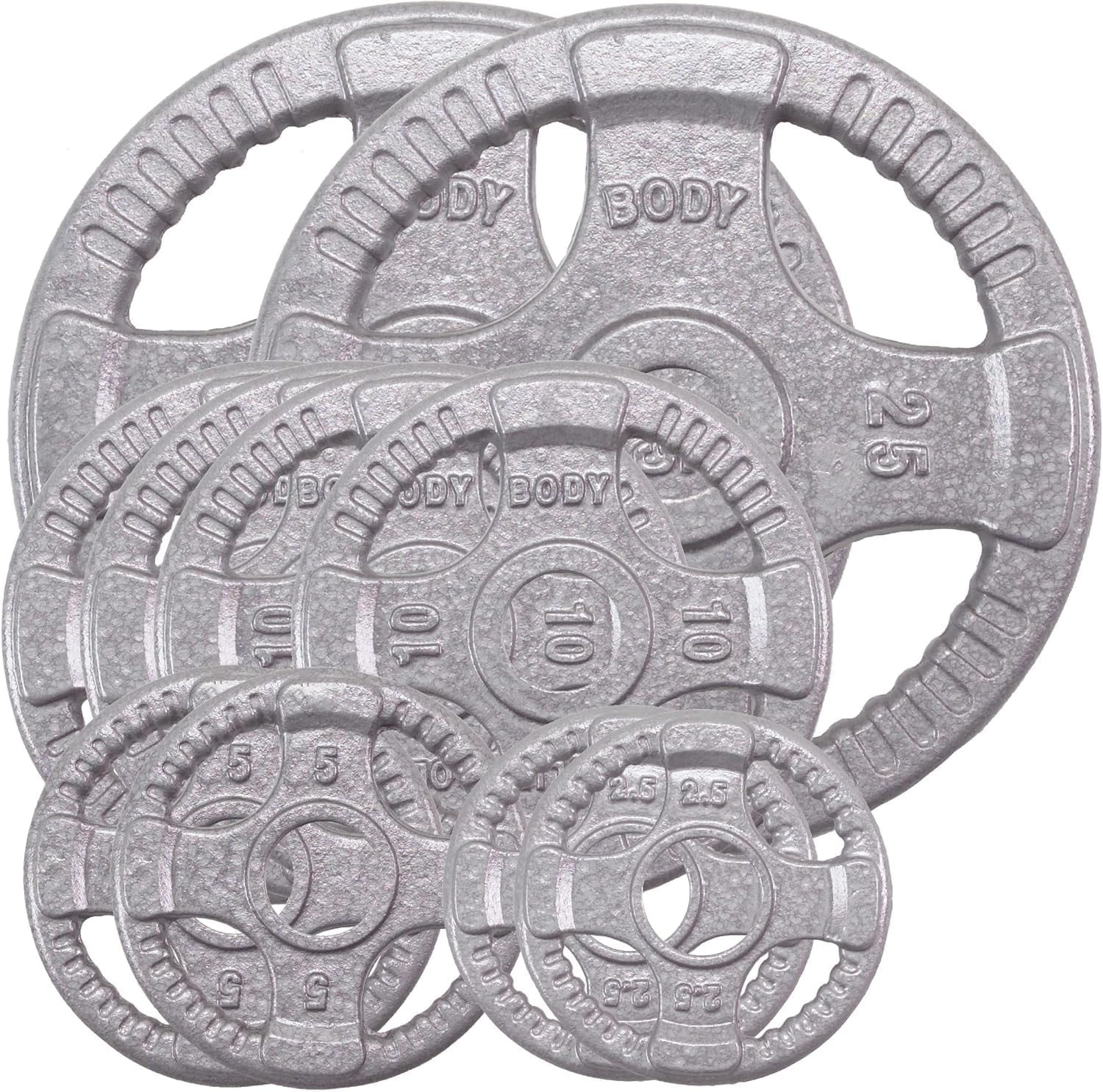 Body-Solid Steel Grip Olympic Sets Fully-integrated, Quad-grip design guarantees safer and easier performance than any other plate on the market. Accurate within 2% or better of stated weight, Body-Solid Steel Grip Olympic plates are cast from the highest quality gray iron, creating an exceptionally strong and durable product. Feature baked on hammertone gray finish that is durable, chip and rust resistant. Heavy lifting has never been easier or safer. U.S. Pat. No. 5,137,502 under license from Iron Grip Barbell Company, Inc