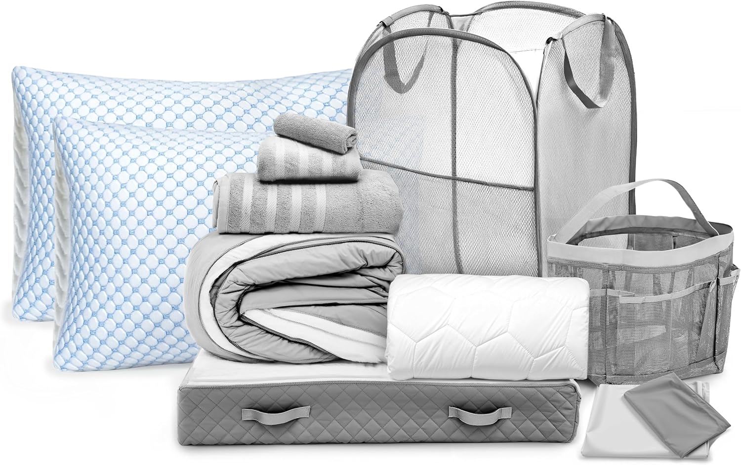 | Included Components | 1 Bath Towel, 1 Hand Towel, 1 Wash Cloth, 1 Reversible Comforter, 1 Fitted Sheet, 1 Flat Sheet, 2 Pillowcases, 1 Pillow Sham, 1 Mattress Protector, 1 Shower Caddy, 1 Collapsible Hamper, 1 Underbed Storage |