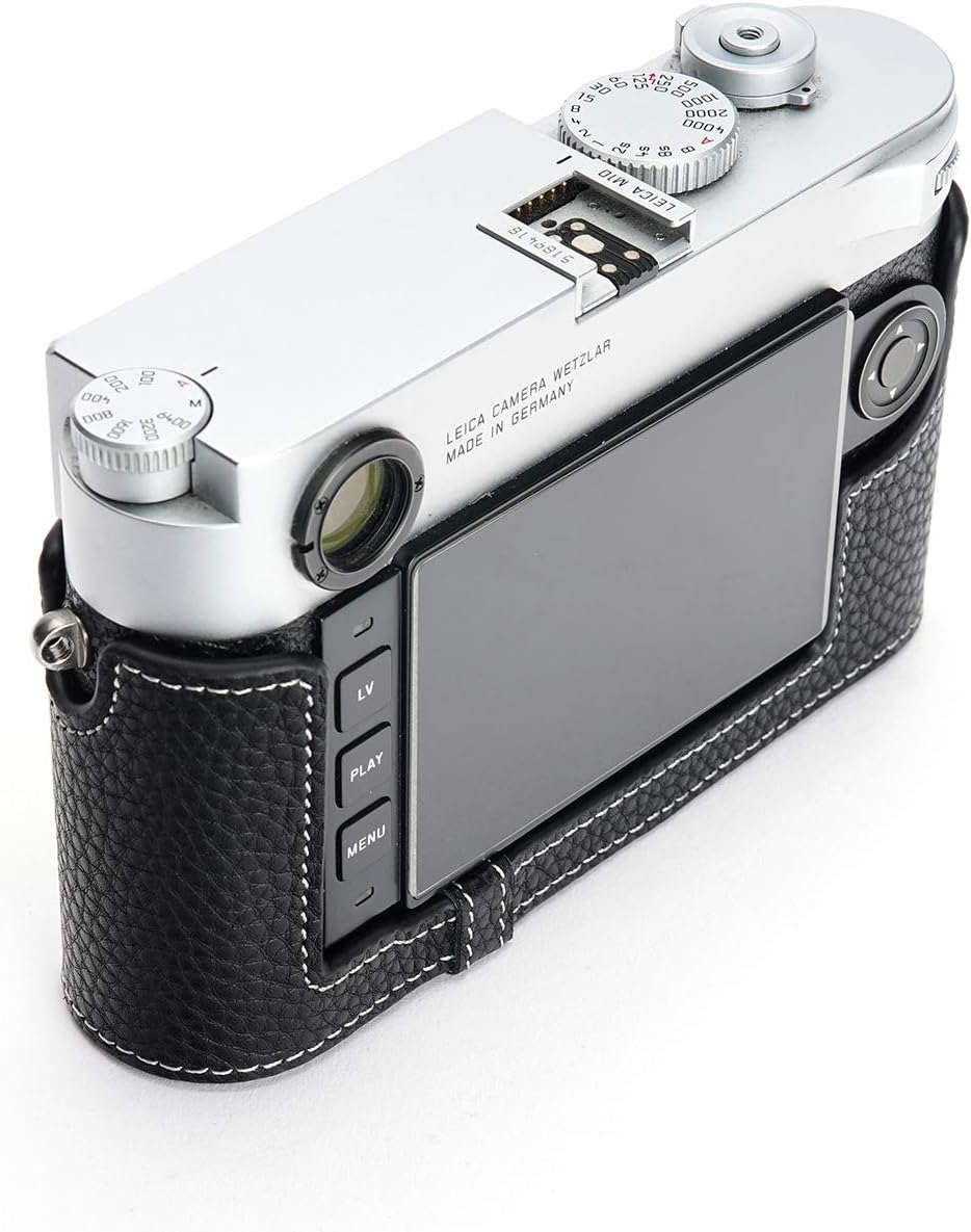 This camera is made by real top layer oil leather, the design is simple and vintage, use Metal sizing techniques make it very fit with the camera body. Inside lining use high lever velvet to protect camera body for scratch and coloration. There is a opening on the bottom for battery, You don't need to take off the half case when you change battery. Under base screw is made by copper and it can easy take off by coin. You don't need to take off the half case when you use tripod. It has a special design for Leica M10 Camera which makes it easy to turn over the Screen and it will totally not affect screen rotation. You don't need to take off the half case when you connect data lines. Content: 1 x camera half case, 1 x Free Genuine Real Leather Hand Strap, camera not included. Material:Genuine leather.