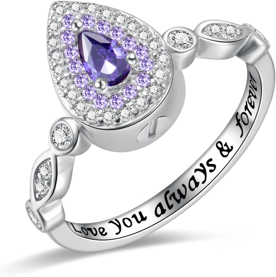 The Meaning of Teardrop Cremation Ring: This ring is a unique design with teardrop. The transparent zircon represents your pure and bright teardrop. This teardrop ring for ashes can be used to hold ashes of the person who is brave, positive, and kind, he/she may be your family, lover, friend, etc. You can keep their memories alive with you wherever you go, whatever you do The significance of Cremation Urn jewelry: The secret interior compartment is protected by a threaded screw and can be filled with the ashes or heair of a loved one and may have special meaning for you in representing that which has no end or limit. Even if your loved one was not cremated and you can have a very tiny lock of hair to put in. The exterior of the jewelry gives nothing away about what the inside holds, making it personal yet a highly discreet memorial to a loved one that has passed away. Package contain: 1*Teardrop ashes urn ring 1*Exquisite gift box 1*Silver cloth 1*Tool set How to protect the silver jewelry? We do not recommend wearing the silver jewelry while showering, swimming, exercising, or sleeping as this can increase exposure to moisture which can expedite the tarnishing process and degrade the adhesive that keeps ashes secure inside the pendant.