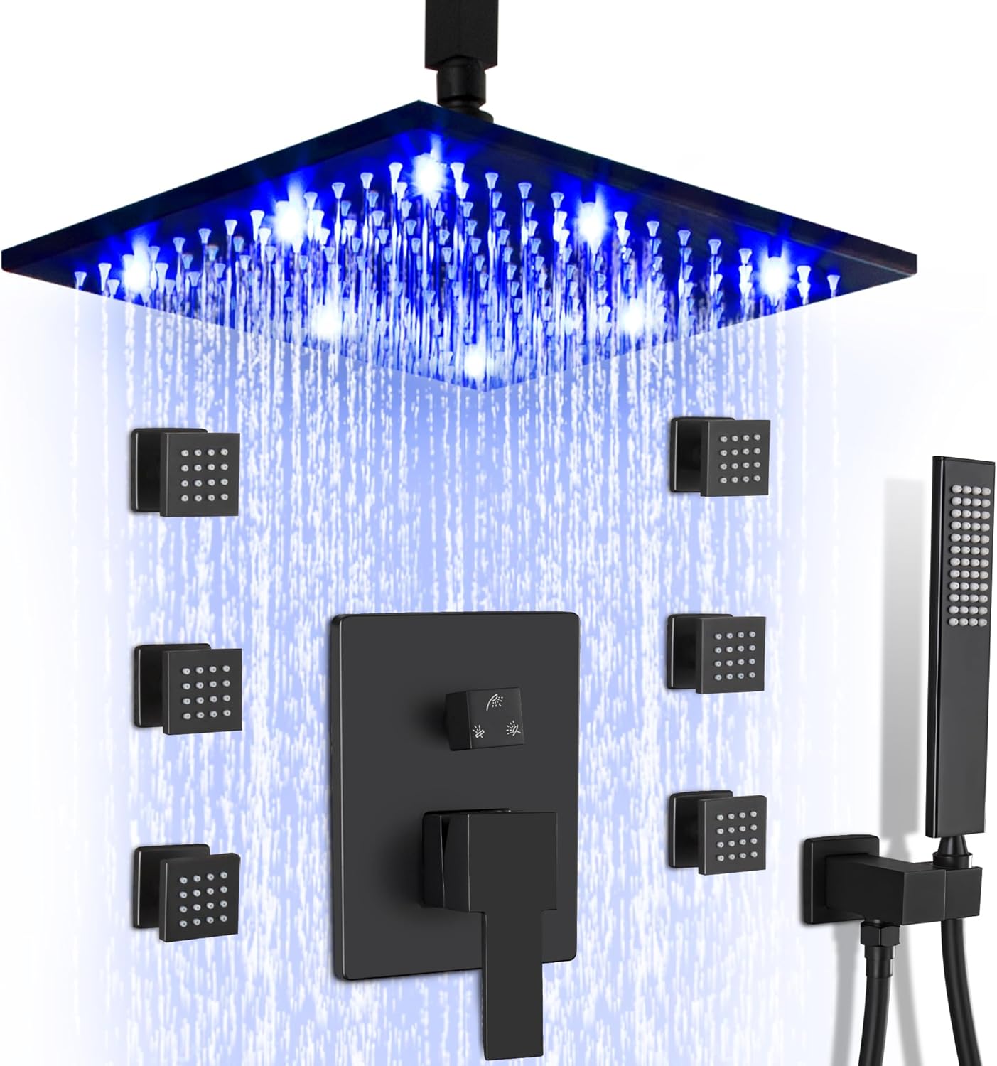| Included Components | 8-Inch ceiling mount shower arm, 12-inch LED shower heads, Brass Shower holder, 79-Inch shower hose, Brass handheld shower, Brass pressure dual function balance shower valve, Panel, Handle, Switch Knob, Teflon Tape |