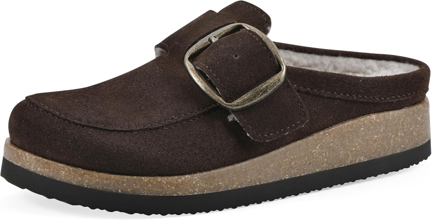 The Bueno by White Mountain Shoes is a classic moccasin-style clog that is right on trend. This clog has a contoured footbed to hug your foot and a soft cork bottom for maximum comfort. The oversized statement buckle makes this clog stand out. This shoe is perfect to throw on when it's chilly and is made out of genuine leather that lasts!