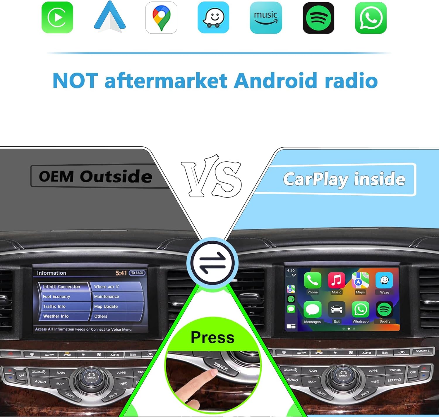 • 【Dual-System Operation】: Switch between OEM and CarPlay/Android Auto in a flash—just press the "BACK" button. Keep all factory features and safety systems fully active.